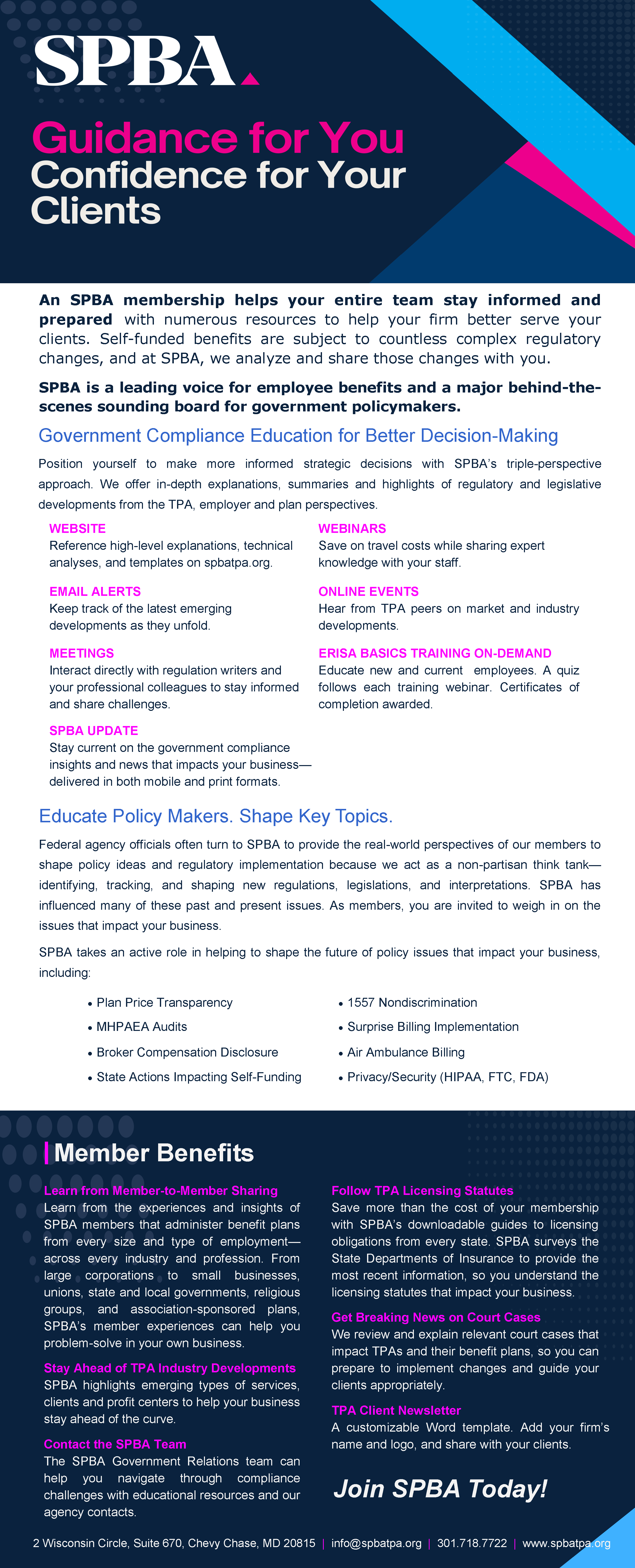 We consider SPBA dues to be our TPA members’ most profitable business investment each year. That’s because members receive in-depth explanations, insights on industry trends and the real-world impact of government rules affecting employee benefits … all delivered in a timely fashion! Plus, members can stay educated and connected through several SPBA channels. These include our members-exclusive website packed with helpful info as well as regulatory alerts that outline the facts, shed light on the regs and share the industry’s own “take” on the issues.